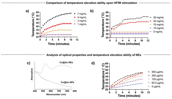 (a,b) Concentration-dependent hyperthermia ability of round Co@Au nanoparticles (Co@Au NPs) and elliptical Co@Au (Co@Au NEs) nanoparticles. x-axis highlights time; y-axis temperature (c) Analysis of optical properties of Co@Au NPs and NEs via Uv-vis spectrophotometry. (d) Concentration-dependent hyperthermia ability of Co@Au NEs upon photostimulation. x-axis highlights time; y-axis temperature.