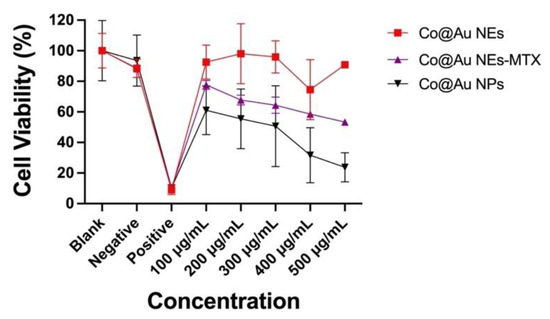 The primary aim of this study is to elucidate the shape-dependent cytotoxicity of nanomaterials and extend the applications in the field of cancer therapy. To understand this, three experimental groups were prepared, (i) Co@Au NPs (ii) Co@Au NEs and (iii) Co@Au NEs-MTX. MTT assay revealed that viability of L929 fibroblasts was maintained above 90% for NEs at 100 μg/mL concentration which dropped to nearly 85% at 500 μg/mL (Figure 5). In contrast, NPs displayed high cytotoxicity with viability maintained close to 61% at 100 μg/mL concentration which dropped to nearly 20% at 500 μg/mL (Figure 5). Thus, at identical concentrations, NPs were 4-folds more cytotoxic than the NEs which can be attributed to the variation in the nanomaterial shape. This could also be due to the difference in size between NPs and NEs; however, more experiments are needed to validate this. The experimental group containing anti-cancer drug-conjugated Co@Au NEs (Co@Au NEs -MTX) displayed a linear decrease in effect on cell viability due to an increase in the concentration (Figure 5). Notably, this decrease was still not as stark as the one show by NPs, which implies that Co@Au NPs were even more cytotoxic than the anti-cancer drugs. The results of these experiments highlighted that Co@Au NEs were better suited for biological applications than NPs owing to their superior biocompatibility. Therefore, NEs were employed for further experiments. Previous studies have also highlighted the possible role of CTAB in inducing cytotoxicity [32,33]. Thus, the possible role of CTAB in inducing cytotoxicity within the Co@Au NPs experimental group cannot be ruled out, and further experiments must be performed to clarify this. However, given the similarity in the procedure to synthesize NPs and NEs, it is hypothesized that geometry, and not surfactant, is the main reason for higher cytotoxicity of the nanoparticles.