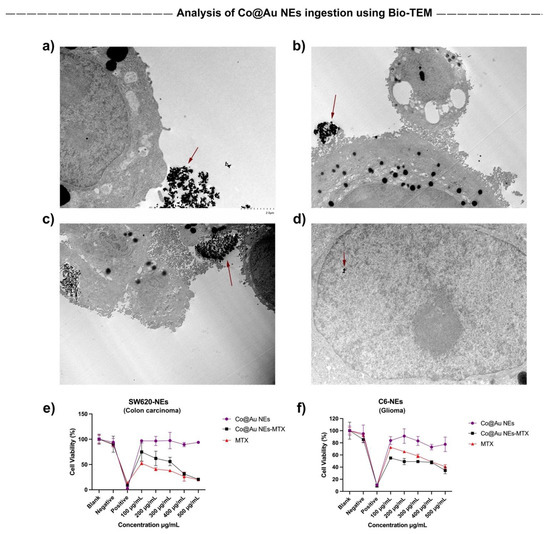 Analysis of elliptical Co@Au (Co@Au NEs) nanoparticle ingestion by SW620 colon carcinoma cells. (a–d) Bio-TEM micrographs of Co@Au NEs aggregates in SW620 cells after 12-h incubation. The scale bar in figure (a–d) is 2 µm. (e,f) Cytotoxicity of Co@Au NEs towards SW620 and C6 glioma cells, respectively. Elliptical nanoparticles displayed higher toxicity towards colon carcinoma cells. Nanoparticle clusters are represented by arrows.