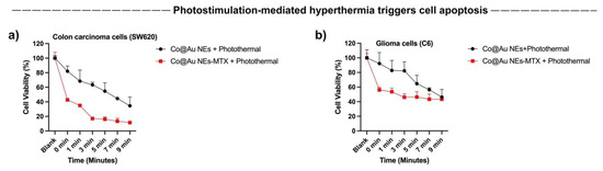 We repeated similar experiments on C6 Glioma cells and observed a similar trend of cell viability in both experimental groups, i.e., the cell viability declined as a function of exposure to the photothermal stimulation (Figure 8b). For the NEs-MTX experimental group, the C6 glioma cell viability was maintained at 60% after 30 s of stimulation and further decreased to 40% after 9 min of photothermal stimulation (Figure 8b). The percentage dead cells were higher than the lone Co@Au NEs experimental group. Overall, the extent of cell death was lower than what was observed in SW620 cells. The results highlight that the Co@Au NEs can be expected to display a better efficacy in targeting colon carcinoma cells. The reason regarding a greater cell death shown by a specific cancer cell type towards the nanoparticulates is currently now known but will continue to be a focus of the future studies.