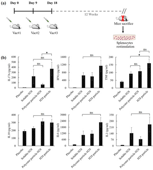 Induction of cytokines by particulate vaccines. (a) Timeline of the immunization schedule and memory response study. (b) Mice were sacrificed 12 weeks after the final vaccination. Murine splenocytes were cultured for 24 h with soluble H28. The release of cytokines was determined by a cytometric bead array. Each data point represents the mean for 8 mice ± the standard error of the mean. *, significant difference between experimental groups (p < 0.05); ns, no significant difference between experimental groups (p > 0.05).