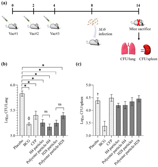 There was a significant reduction of CFU counts in the lungs of mice receiving the particulate mycobacterial vaccines (H4 nanoparticles, polyester nanoparticles-H4, H28 nanoparticles and polyester nanoparticles-H28), CFP and BCG compared to the Tris buffer-immunized negative control, placebo group (Figure 4b) (p < 0.0001). There was no significant difference in the lung CFU counts between the mice immunized with polyester nanoparticle-H4 and those immunized with H4 nanoparticles. The same observation was also found in the mice vaccinated with polyester nanoparticle-H28 and H28 nanoparticles (Figure 4b) (p > 0.05). Encouragingly, the CFU counts in the lungs of the mice immunized with BCG showed no significant differences with the other vaccinated groups (H4 nanoparticles, polyester nanoparticles-H4, H28 nanoparticles, polyester nanoparticles-H28, and CFP) (Figure 4b) (p > 0.05). However, the mice vaccinated with particulate mycobacterial vaccines showed no significant reduction in CFU counts in the spleen compared to the negative placebo group (p > 0.05).
