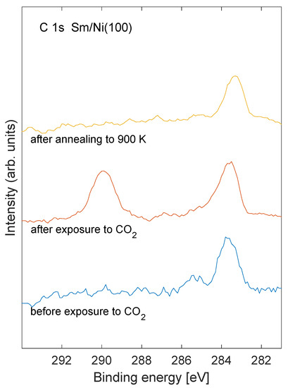 C 1s XPS recorded before exposure to CO (bottom spectrum), after exposure to CO (middle spectrum), and after annealing to 900 K (top spectrum). The Sm coverage was estimated to 0.8 ML.