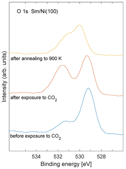 O 1s XPS recorded before exposure to CO (bottom spectrum), after exposure to CO (middle spectrum), and after annealing to 900 K (top spectrum). The Sm coverage was estimated to 0.8 ML.