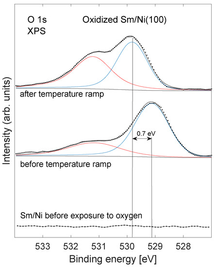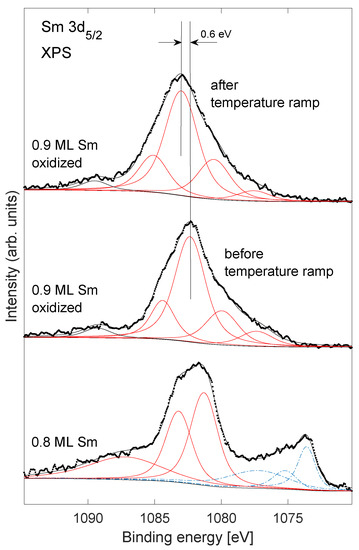 Samarium XPS are shown in Figure 4 for Sm/Ni (bottom spectrum) and Sm/Ni exposed to oxygen (two top spectra). The 3d XPS of Sm is made complicated by multiplet interactions between the open 4f shell and the valence electrons [25,26]. Deconvoluted components are shown as solid lines for the Sm components, and as dashed lines for the Sm components (for the metallic spectrum). These components do not represent the true multiplet structure of Sm but merely represent the smallest number of peaks that give a reasonable fit to the data. Only trivalent Sm was observed in the spectra from the samples that were exposed to oxygen. XPS from rare earth oxides is rather complex and the weak components at lower binding energy as compared to the main peak have been identified as due to strong charge transfer of unpaired 4f electrons [27,28]. The main component of the convolution of the spectra of the sample exposed to oxygen is shifted 0.6 eV to higher binding energy after the temperature ramp (see two top spectra in Figure 4). Table 1 lists XPS intensities for Sm 3d and O 1s core levels relative to the intensity of the Ni 2p core level. The intensities have been corrected by using atomic sensitivity factors. It is seen from the table that the Sm intensities show relatively small reductions (≤10%) after annealing to 900 K. For the lowest Sm coverage, 0.4 and 0.9 ML the oxygen intensity decreases substantially. For the higher Sm coverage, 1.9 ML, the relative Sm and O core level intensities showed relatively small increases (<10%) after annealing.