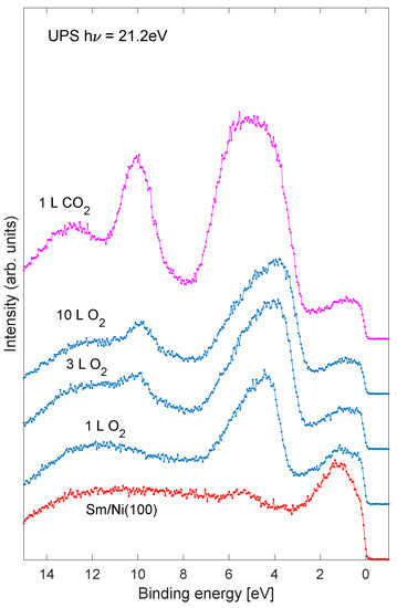 UPS of the valence band region of the Sm/Ni system is shown in Figure 5. The bottom spectrum corresponds to pure Sm/Ni. As the sample is exposed to oxygen the O 2s emission near 5 eV binding energy grows. A feature near 10 eV emerges for the two largest oxygen exposures (middle curves). Upon exposure to carbon dioxide the 10 eV feature increases significantly. This peak is identified as C 2s, possibly originating from carbonate species, as indicated by the C 1s spectra in Figure 1 [29,30].