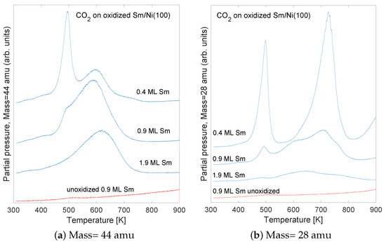 Carbon dioxide (mass 44 amu) TPD spectra are shown in Figure 6a for effective Sm coverage of about 0.4, 0.9, and 1.9 ML. Two distinct desorption features are observed for sub mono-layer Sm coverage; one near a temperature of 500 K and the other near 600 K. For the highest Sm coverage of 1.9 ML only the 600 K desorption peak was resolved. It seems likely that the Sm-Ni interface play a more important role in the case of sub-mono-layer Sm coverage as compared to multilayer coverage. It is therefore argued that the sharp TPD peak observed near 500 K for the 0.4 ML Sm coverage (top curve of Figure 6a) originates from the interface between O, Sm, and Ni. This peak becomes weaker for 0.9 ML Sm coverage, and has disappeared in the spectrum from the 1.9 ML Sm sample, where most of the surface is expected to be covered by Sm and CO is likely to adsorb on the Sm–O interface.