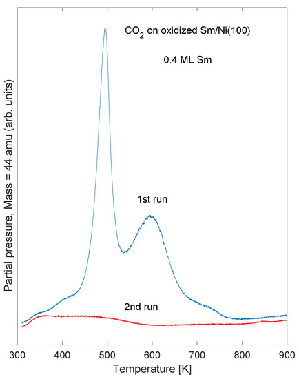Another observation was that very little carbon dioxide was adsorbed on the sample after temperature cycling up to 900 K and subsequently down to near 300 K. This is shown in Figure 7 for Sm coverage 0.4 ML. Similar observations were also seen for Sm coverage 0.9 and 1.9 ML. This finding is likely to be caused by changes in sample morphology upon heating, as also indicated by the XPS results.