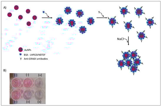 Under the described experimental conditions, and after overnight incubation, there was a clear difference of the AuNPs’ UV–Vis spectrum (Figure 7A) and color between the positive and negative serum samples. MUA-AuNPs GRA6II turned blue in the presence of positive human sera pool. On the contrary, MUA-AuNPs in the presence of negative human sera pool remained red (Figure 1B).