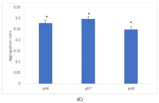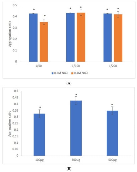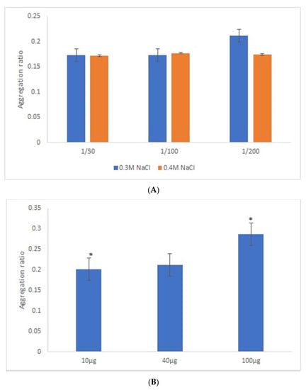 Aggregation ratio variation between positive and negative serum samples for 42-nanometer AuNPs bioconjugated with GRA6II-BSA. (A) Three sera dilutions were tested (1/50, 1/100 and 1/200) and two NaCl concentrations (0.3 and 0.4 M). (B) The following three GRA6II-BSA concentrations were compared: 100, 300 and 500 µg/mL. (C) The following three pH values were compared: pH 6.0, pH 7.0 and pH 8.0. * represents statistically significant differences between aggregation ratio of positive and negative serum samples, for each experimental condition.