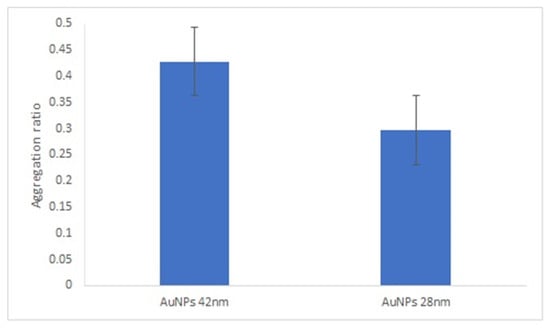 It is known that the size of spherical gold nanoparticles influences their ability to enhance the response of optical biosensors [31]. We compared the AuNPs’ aggregation ratio under the best experimental conditions for both sizes of AuNPs. Overall, the aggregation ratio of AuNPs-GRA6II-BSA in the presence of positive sera was higher for 28-nanometer AuNPs. However, the difference between the positive and negative sera was more intense with the larger AuNPs (Figure 4).