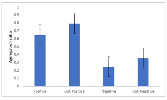 In this study, the following blocking agents were tested: BSA, Tween 20 and ethanolamine. In the presence of Tween 20 and ethanolamine, both the positive and negative serum samples aggregated (Supplementary Figure S14). These two agents clearly destabilize the bionanoconjugates. When BSA was used as the blocking agent, the difference between the aggregation ratio for the positive and negative samples was similar to the aggregation ratio in the absence of BSA (Figure 5). Based on this, we concluded that the blocking step with BSA is not necessary when GRA6II-BSA is used as an antigen, which indicates that the amount of GRA6II-BSA used in the bioconjugation process (300 µg/mL) is enough to create a complete monolayer and it is closed to the saturation point of the AuNPs. According to the zeta potential results, the saturation point for 42-nanometer AuNPs was obtained with a GRA6II-BSA concentration around 400 µg/mL (Supplementary Figure S4B).