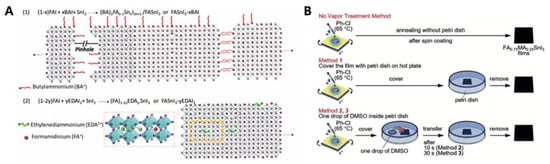 (A) Schematic representations of perovskite crystals in the presence of BAI and EDAI2 additives. Reprinted with permission from ref. [34] Copyright 2018, the Royal Society of Chemistry. (B) Illustration of the vapour modification method discussed in this review. Reprinted with permission from ref. [36]. Copyright 2018, the John Wiley and Sons.