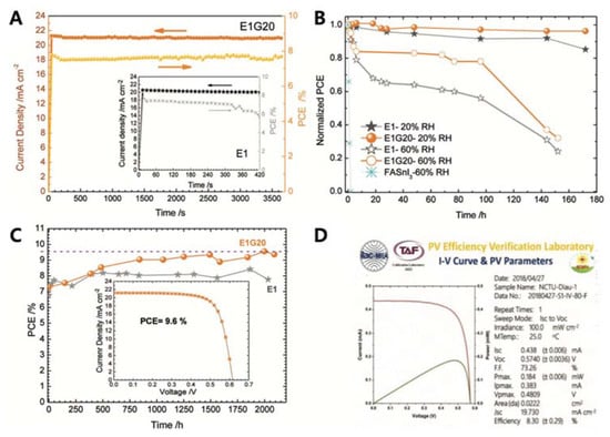 (A) Stabilised efficiency of power conversion and photocurrent density of two different devices tested in different environments. The measurement was taken at the position of maximum power for 1 sun irradiation with an AM1.5G solar simulator for 3600 s. Device reliability test conducted in (B) ambient air with relative humidity = 20% and 60% without encapsulation and (C) in N2-filled glove box. (D) Efficiency of 8.30%, certified by ISO-approved PV Efficiency Verification Laboratory in Taiwan. Reprinted with permission from ref. [38] Copyright 2018, the John Wiley and Sons.
