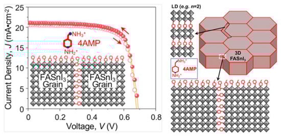 Schematic illustration of the optimum 4AMP functionalisation of grain surfaces and grain boundaries in FASnI3 perovskite polycrystalline thin film, together with the J–V curves of the devices showing negligible hysteresis. Reprinted with permission from ref. [42] Copyright 2020, the American Chemical Society.