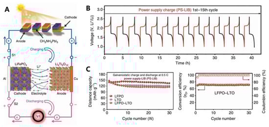 Electric vehicles that use lithium-ion batteries (LIBs) have attracted significant interest. LIBs have high energy density and does not have the memory effect. Suffering from small self-discharge is another advantage of LIBs. The performance of LIBs is determined by stable charging and discharging of the current density over copious cycles. Parameters like the battery state of charge (BSOC), defined by the fraction of the total energy or battery capacity discharged over the total available is used a one of the parameters. One way to augment the performance of batteries in electric cars is via the application of self-charging suppliers. This can be achieved in numerous ways, one of which is the installation of a solar roof. Thin-film perovskite photovoltaics are attractive as they can directly photo-charge LIBs. However, no study has been conducted on the integration of Sn-PSCs and batteries, and only a few reports on the photo-charging of Pb-based PSCs are available. In this section, we examine these publications and elucidate the potential of Sn-PSCs using a similar approach. In 2015, Xu et al. [54], connected four single MAPbI3-based PSCs in series with an LIB assembled with a LiFePO4 cathode and a Li4Ti5O12 anode. The integration yielded a photoelectric conversion and storage efficiency of 7.80% with adequate cycling stability (Figure 7). A PCE of 12.65% was achieved when all four cells were connected. Each cell exhibited an average PCE of 15.67%. At 0.5 C, the PSC–LIB exhibited a capacity retention rate similar to that of galvanostatically charged and discharged LIBs with a conventional power supply, when measured from 0.1 C to 1 C. In 2017, a simple and efficient photo-charging design, which used a DC–DC voltage boost converter between a PSC and a Li4Ti5O12-LiCoO2 Li-ion cell, was proposed by Gurung et al. [55]. The converter boosted the low input voltage of the PSC to charge the lithium-ion cells more effectively and offer overvoltage protection. This approach resulted in an efficiency of 9.36% and an average storage efficiency of 77.2% at 0.5 C discharge. The high charging efficiency of the PSC–LIB was attributed to the high PCE of the PSCs and low potential polarisation between the charge and discharge voltage plateaus of the Li4Ti5O12–LiCoO2 Li-ion cell. Li et al. [56] demonstrated a system wherein PSCs, LIBs, and strain sensors were combined in a flexible assembly. A wearable PSC-LIB-driven photo-rechargeable lithium-ion strain sensor showed a PCE of 8.41% and an output voltage of 3 V at a discharge current density of 0.1 A g−1. The device could achieve a significantly high PCE of approximately 6% at a high current density of 1 A g−1, which is one of the highest reported performances for photo-charging power sources.