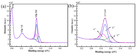 XPS spectra of the V2O5 film (a) and curve fitting of V2p3/2 spectra (b).