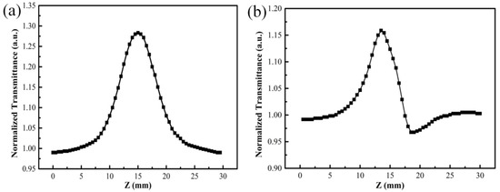 where Δϕ0 is the axial phase shift at the focus, and ΔTp−v is the difference value between the normalized transmittance peak and valley. Closed-aperture normalized transmittance can be simplified as [21]