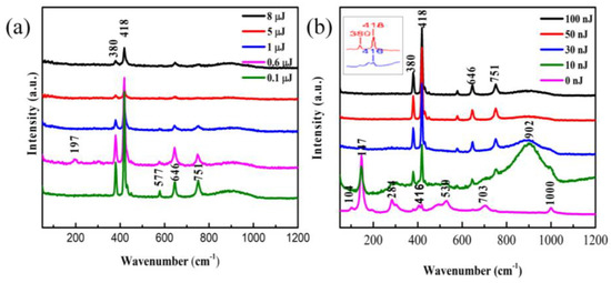 As shown in Figure 6, the results show peaks at 104, 147, 197, 284, 380, 418, 416, 530, 646, 703, 751, 902, and 1000 cm−1. Compared with the unirradiated film (the curve corresponding to 0 nJ), the redshift of the Raman spectrum indicates the presence of the stress in the film. When there is a stress in the film, the bond length will change, therefore the vibration frequency of the bond will change, resulting in the shift of the Raman spectra. Hence, the peak located at 418 cm−1 is offset from the peak at 416 cm−1.