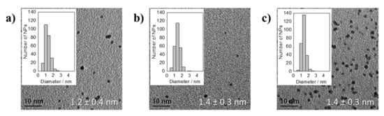 TEM micrographs of averaged particle sizes together with the standard deviation and NP size distributions of thermally formed Pt NPs by using H2Pt(OH)6 as precursor in presence of NaOH with different OH−/Pt ratios of: (a) 12.2 (after 10 min of synthesis), (b) 9.2 (after 5 min), and (c) 7.6 (after 5 min).