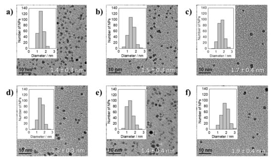 By changing the base from inorganic NaOH to organic Na(acac) the thermal reduction of H2PtCl6 occurred substantially faster (about 1 min of reduction) and heating periods longer than 20 min led to sintering and flocculation of the NPs. This is different to the previous experiments. The presence of acac− and chloride anions seem not to be able to take over the stabilizing role that OH− fulfills in the experiments using H2PtCl6 or H2PtBr6 as precursors. Therefore, it can be assumed that the NPs might be less protected against an attack by chloride resulting in Ostwald ripening as discussed by Neumann et al. [] or coalescence. While the NPs sintered during longer reduction times, after 10 min the acac−/Pt ratios of 48.8, 24.4, 12.2, 9.2, 6.1 and 5.4 led to stable NPs with sizes within the size error of 1.4–1.9 nm determined by TEM analysis, see Figure 4. The obtained particle sizes in Figure 4 were slightly smaller at low OH−/Pt as compared to the size reported for the reduction of H2PtCl6 in presence of NaOH []. Using an acac−/Pt ratio of 4.6 and 2.4 did not lead to stable NPs. The NPs already sintered during the thermal reduction, but at the higher acac− concentrations the dispersions remained stable for several days. Interestingly, although the reduction rate and stability are affected using Na(acac), in the reduction of H2PtCl6 the particle size was comparable to the system with NaOH as base and no Ostwald ripening was observed. Hence, the smaller NPs might be obtained due to leaching induced by chloride without a following Ostwald ripening, which was observed also by Neumann et al. [] only after longer reaction times.