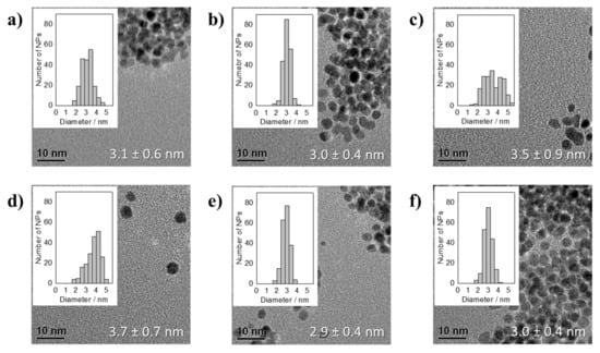 TEM micrographs of averaged particle size together with the standard deviation and NP size distribution of thermally formed Pt NPs by using Pt(acac)2 as precursor in presence of Na(acac) with different acac−/Pt ratios of: (a) 24.4, (b) 12.2, (c) 9.1, (d) 6.1, (e) 5.4, and (f) 4.6 after 150 min of synthesis.