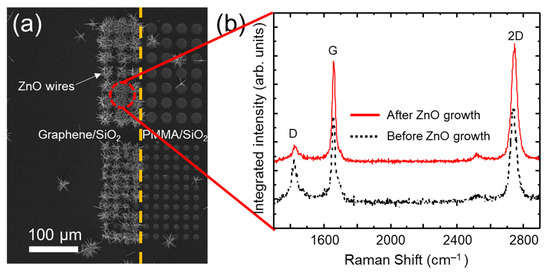 Raman spectroscopy is a non-destructive technique commonly used to probe various carbon nanostructures [29,30,31]. The position and intensity ratios of the characteristic Raman bands (D, G, and 2D band) of graphene are used to characterize crystallinity, number of layers, doping level, presence of defects and the type of functional groups, etc. A frequency doubled 532 nm Nd:YAG laser was employed to generate the Raman scattering on the graphene sheets before and after the removal of ZnO NWs via the wet etching. In order to characterize the same position on the graphene surface, the locations of ZnO NWs on graphene were defined by e-beam lithography. The graphene area was patterned to check the quality of the graphene layer on a defined spot during repetition of the cycle consisting of growth and separation of ZnO NWs. Figure 4a shows the SEM image of hydrothermally grown ZnO NWs on a hole patterned PMMA/monolayer graphene/SiO2/Si substrate. The observation of selective growth of ZnO NWs on the exposed graphene areas is consistent with the result shown in Figure 1. The area marked with the ‘Red’ circle in Figure 4b indicates the position where Raman spectra of graphene were acquired before and after growth of ZnO NWs. Raman spectra were also acquired after growth of ZnO NWs and before the partial etching of ZnO NWs. Figure 4b shows three distinct peaks at ~1420 (D), ~1650 (G), and ~2740 (2D) cm−1, which can be assigned to an A1g breathing mode originating from disorders, to the high frequency E2g, and to the second order of the D, respectively [32]. Raman analyses were employed to monitor band intensities and ratios, hence providing information on graphene structural integrity. Raman spectroscopy is also a well-defined method to measure the number of graphene layers [32,33]. The Raman spectrum of the transferred graphene before the ZnO growth indicates the presence of a crystalline sheet [29]. To maintain the quality of the graphene during transfer, we used our newly developed PMMA-free transfer method while minimizing introduction of defects and avoiding impurities [18,34].