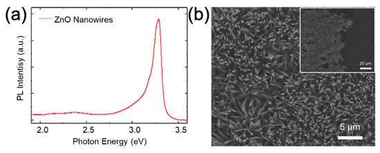 (a) RT PL spectrum of ZnO wires after the 4th cycle of the growth-etching process. (b) SEM images of ZnO wires grown on graphene after the 7th growth and etching cycle. The inset is a low magnification image of the ZnO wires. There was no growth of ZnO wires on SiO2 layer.