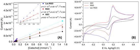 | CV | Lac/rGO/GEC | 2.1 | 0.431 (15.39 µA µM−1 cm−2) | 2–100 | - |