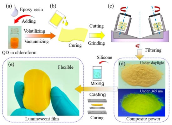 In this study, CdSe/ZnS core-shell QDs with an emission peak of 570 nm were bought from Beida Jubang Co. Ltd (Beijing, China). as in our previous works [], which quantum yield is about 85%. First, 120 mg of QDs was dissolved in chloroform, followed by the addition of 4 g of epoxy resin (IK0010, IK INABATA & Co., Ltd., Tokyo, Japan) into the mixture. Subsequently, in order to completely volatile the chloroform, the mixture was subjected to centrifugal stirring with 400 rpm revolution rate and 300 rpm rotation rate for 2 h using a mixer (FY-821, Shenzhen Fuyuanxiang Electronic Equipment Co., Ltd., Shenzhen, China). Subsequently, 4 g of epoxy crossing resin was added to the mixture, and the mixture was stirred in vacuum to ensure uniform mixing and removal of bubbles. Finally, the mixture was tape-casted on a PET film and cured at 150 °C for 3 h. The curing films were cut into small pieces and then ground at 450 rpm for 5 h by a ball grinder. This process is illustrated in detail in Figure 1. After filtering, uniform QDs/epoxy composite particles (QE CPs) were obtained; the photograph of the composite particles is shown in Figure 1d.