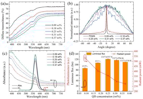 To obtain film flexibility, the composite particles were encapsulated in silicone resin, and different composite particle concentration would change the film optical performance. The CPF films with different composite particle concentration were prepared to study these issues (Figure 3). The diffuse transmittance of CPF films related to composite particle concentration is illustrated in Figure 3a. As the QD concentration increased from 0.09 to 0.37 wt%, the diffuse transmittance decreased gradually. The CPF films exhibited lower transmittance at shorter wavelengths and higher transmittance at longer wavelengths due to the light absorbance of QDs. Particularly, the diffuse transmittance at 450 nm decreased from 53% to 13%, indicating a strong QD absorbance. Meanwhile, the addition of composite particles may change the light scattering performance caused by the index difference between the PDMS and epoxy resin. The BTDF normalized intensity was tested to evaluate the film scattering ability; the results are shown in Figure 3b. The normalized angular intensity distribution of the film was tested after passing a 632-nm laser beam through the testing films. There exists a significant peak at 0° in pure PDMS as well as CPF films with a relatively low QD concentration of 0.09 wt%. As the composite particle concentration increased, more light scatters to larger angles due to the increase in the scattering ability. When the QD concentration is larger than 0.31 wt%, the scattering ability becomes saturated and the intensity begins to decrease because of the lower transmittance and light absorbance. It is evident that the composite particles can enhance the light scattering path, which may contribute to improving the QD excitation. Figure 3c shows the absorbance and PL intensity of CPF films. The CPF films exhibit an absorbance peak at about 552 nm. The composite particle concentration affects the absorbance to a large degree, and a larger concentration leads to greater light absorbance. Subsequently, the PL intensity with an emission peak located at 567 nm becomes stronger as the composite particle concentration increased, and it finally reaches a balance point, which is limited by the film transmittance. The PL intensity profile reveals that more QD light could be obtained by increasing the composite particle concentration.