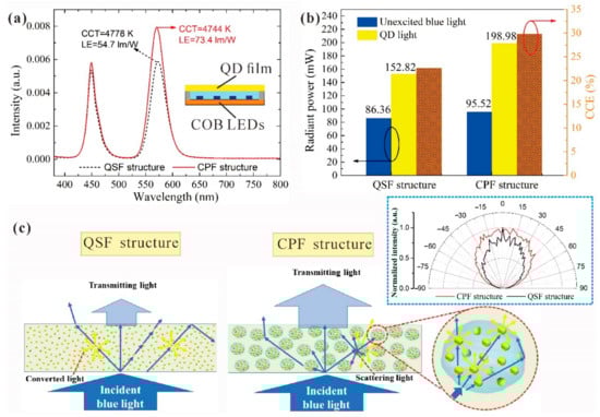 To ensure the practical application potential of composite particles, a QSF structure was fabricated by direct dissolving of QD in silicone, and its performance was compared with that of the CPF structure. Both structures were adjusted the QD concentration to ensure the same lighting effect. As can be observed in Figure 4a, COB-LED-based devices with both these structures exhibit the same lighting effect with a CCT of about 4761 K at driving current of 150 mA. The inset shows the structure of COB-LED device. The QD films were coated on blue COB-LED devices. Under a similar CCT, the devices with a CPF structure demonstrated better luminous efficiency (LE) than those of devices with a QSF structure. The LE for devices with a CPF structure was 73.4 lm/W, a 34.2% enhancement compared to those of devices with QSF. This can also be seen from the spectra of the two structures in Figure 4a. The intensity of the CPF structure is higher than that of QSF at both the blue and QD light wavelengths. To analyze the LE improvement clearly, the radiant power of the unexcited blue light, as well as QD light, were calculated by integrating the spectrum intensity from 380 to 500 nm wavelengths for blue light and 500 to 780 nm wavelengths for QD light; the results are illustrated in Figure 4b. For the unexcited blue light, the QSF structure exhibited a radiant power of 86.36 mW, which was lower than that of the CPF structure (95.52 mW). The CPF structure contributed positively to blue light extraction, resulting in a 10.6% enhancement of blue light radiant power. For remote QD films, a great interface loss would occur because of the total internal reflectance (TIR) between the film and air. Due to scattering from the composite particles, the TIR loss would be weakened, and the light extraction would be facilitated. The QD light radiant power of the CPF structure is 198.98 mW, which corresponds to a 30.2% improvement than that of the QSF structure. This could be due to the spatial distribution of QDs and the utilization improvement of incident blue light. Moreover, the path length of blue light is increased due to scattering effect, thus enhancing the blue light excitation. Compared to the QSF structure, the CPF structure possesses more blue light and QD light. It can be concluded that the CPF structure contributes positively to improve the color conversion efficiency (CCE). The CCE is defined as the ratio between the emission radiant power from the QDs to the absorbed blue light radiant power, which determines the output color coordinates of LEDs. As shown in Figure 4b, the CCE of the CPF structure is 29.8%, which is 32% higher than that of QSF; this indicates that the energy transfer of the CPF structure is more efficient than that of QSF. The CPF structure exhibits a better optical performance than the QSF structure, which proves that the proposed CPF structure is more suitable for illumination and display.