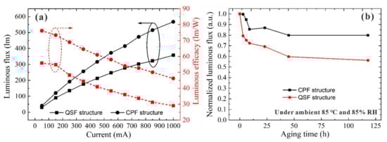 To investigate the film optical stability under different driving currents varying from 50 to 1000 mA, the luminous flux and luminous efficiency of LED devices with two kinds of structural films were studied in Figure 5a. Although the luminous flux of both structural films increases, the luminous efficiency decreases as the driving current increased. The CPF structure performs better than the QSF structure, and the improvement becomes greater as the driving current increased. At a driving current of 50 mA, the luminous flux of the CPF structure is 40.3 lm while that of the QSF structure is 29.5 lm, indicating an enhancement of 36.6% in the former. When the current increased to 1000 mA, the luminous flux of the CPF structure is 567.6 lm, which is 58.9% greater than that of the QSF structure. The luminous efficiency also demonstrates the similar tendency as the luminous flux changed. These results reveal that the CPF structure demonstrates better optical stability than the QSF structure.