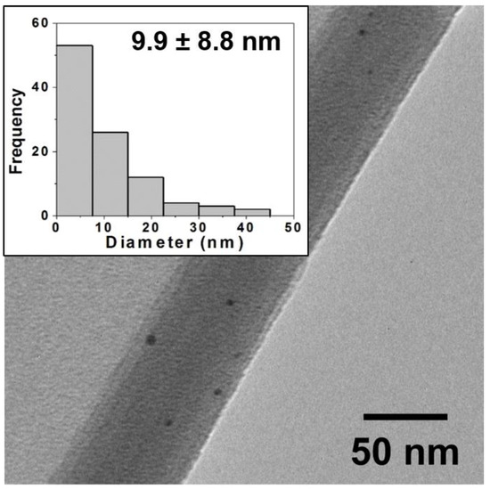 Typical TEM image for oxidative firing samples (80:20) and corresponding histogram analysis of core size (inset) showing a wide distribution of NP sizes with an average diameter of 9.9 ± 8.8 nm. TEM images and histograms for other ratios are provided in the Supplementary Materials. Note: NPs are often observed in images at edges of the ground ceramic shards or where the film is curled back and they are trapped as pictured above.