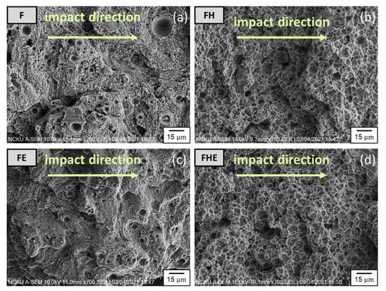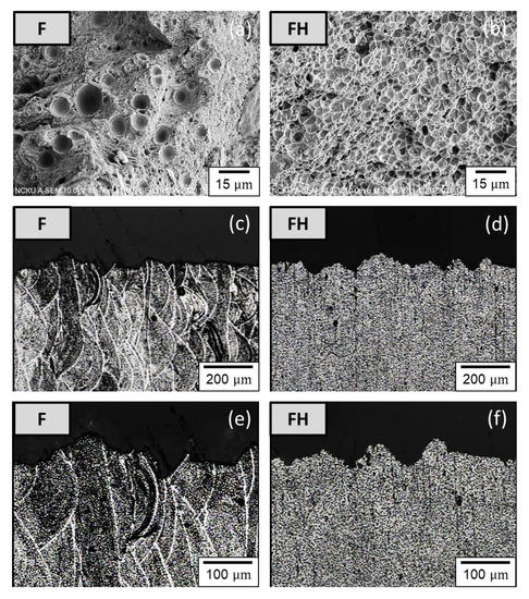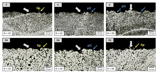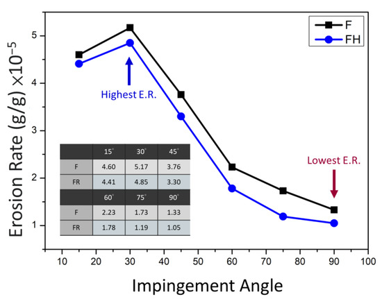 - The maximum and minimum erosion rates of the F and FH groups of specimens occurred at 30° and 90°, respectively. The erosion fracture was dominated by the ductile cutting mechanism. The T6 heat treatment improved the ductility of the material and generated strengthening Mg2Si nanoprecipitates, which can improve the wear resistance of the material.