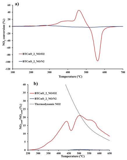 Figure 1a,b shows the NOx conversion (calculated from Equation (2)) and the NO2 generation profiles obtained for the BaTi0.8Cu0.2O3 catalyst under both NO and NO/O2 atmospheres. In these profiles, a positive value of NOx conversion indicates that NOx is stored on the catalyst as the NOx concentration measured by the analyzers is lower than that fed into the reaction system, so, %NOx conversion means %NOx storage. On the contrary, a negative value of NOx conversion reveals that NOx has been desorbed, so in this case, %NOx conversion represents %NOx desorption [23]. A clear influence of the gas phase composition on the NOx conversion profiles is observed. In a NO/O2 atmosphere (red line), the NOx conversion profile shows two adsorption maxima around 300–350 °C and 450 °C, and only one NOx desorption peak at 550 °C. However, in NO/N2 atmosphere (blue line), an almost flat NOx conversion profile is found, suggesting that adsorption/desorption processes do not takes place under these conditions.