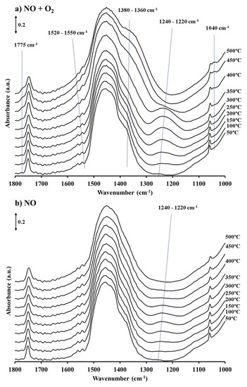 Under a NO/O2 atmosphere (Figure 2a), a band at 1240–1220 cm−1 corresponding to barium nitrites [9,11,17] is identified at 100 °C. The intensity of this band increases with temperature up to 350 °C, when it achieves its maximum intensity. Beyond this temperature, the nitrites band starts to vanish, and new bands grow at 1040, 1360, 1540 and 1775 cm−1 ascribed to the formation of barium nitrates [15,30,31]. The latter bands become the only ones identified in the spectra recorded at 450 and 500 °C, confirming that barium nitrate is the final product in the NOx storage process at high temperature. These results totally agree with previous studies concluding that, under a NO/O2 atmosphere, the formation of nitrites on catalyst is the main route at low temperature, while at high temperature, these groups are oxidized to nitrates [5,11].