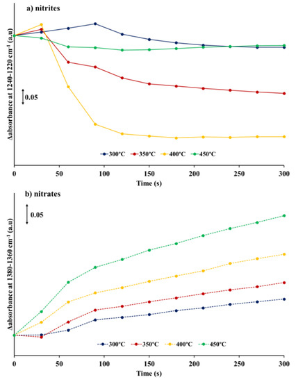 Figure S2a–d (Supplementary Materials) shows the DRIFT spectra obtained during the NOx storage cycles. These spectra show that, at any temperature, the amount of NOx species on the catalyst surface increases with time on NO/O2 stream. However, due to the short time of the storage-cycle and likely overlapping with the carbonate bands, some of the signals ascribed to nitrates and nitrites might be hard to identify. Thus, in order to clarify the analysis, only the evolution in the intensity of two selected bands was followed during NOx exposure: (i) 1240–1220 cm−1 for nitrites, and (ii) 1380–1360 cm−1 for nitrates. In Figure 3a,b, the difference between the absorbance values (after baseline correction) recorded every 30 s and the absorbance value registered once the switch from rich to lean conditions is carried out (i.e., at t = 0 s) is shown as a function of time and for each reaction temperature (300, 350, 400 and 450 °C). As observed under temperature-programmed reaction conditions, at low temperature (300 °C) the NOx storage takes place forming nitrites and nitrates. Thus, at 300 °C, the intensity of the nitrites band (Figure 3a) increases during the early stages of exposure to NO/O2 (~90 s), but longer time on stream involves a depletion of nitrites followed by an increase of the nitrate bands (Figure 3b). As the storage temperature increases, two clear effects can be noticed: