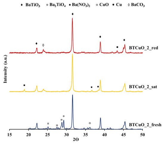 XRD patterns recorded for the as-prepared BaTi0.8Cu0.2O3 catalyst (BTCuO_2_fresh), after 1 h of NOx exposure in 500 ppm NO + 5% O2 in N2 atmosphere (BTCuO_2_sat) and finally after regeneration in 10% H2/N2 atmosphere (BTCuO_2_red).