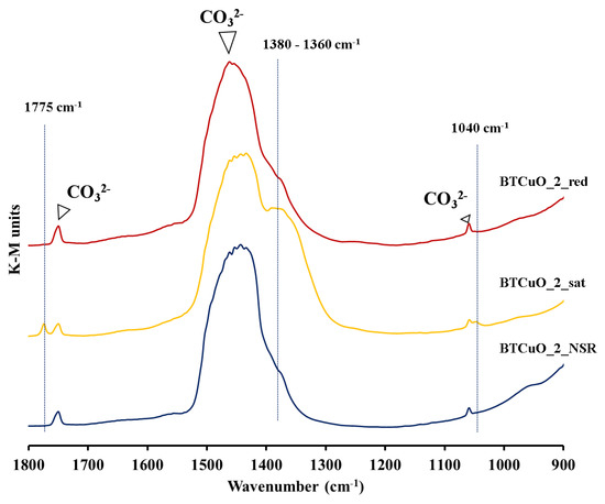 Despite significant visual changes in the intensity of the carbonates band at ~1460 cm−1 are not observed in the spectra (Figure 5), ATR spectroscopy has been used for estimating the percentage of carbonate remaining after every pretreatment (see Experimental Section for details). Data in Table 2 show that the percentage of barium carbonate decreases after NOx uptake experiments, confirming that carbonates are removed from the catalyst during Nox exposure because they are displaced by NOx, leading to nitrates as a final product (Figure 5). After catalyst regeneration (BTCuO_2_red), a recovery of the carbonate percentage due to the adsorption of atmospheric CO2 on the BaO phase, formed from barium nitrate decomposition, is found.