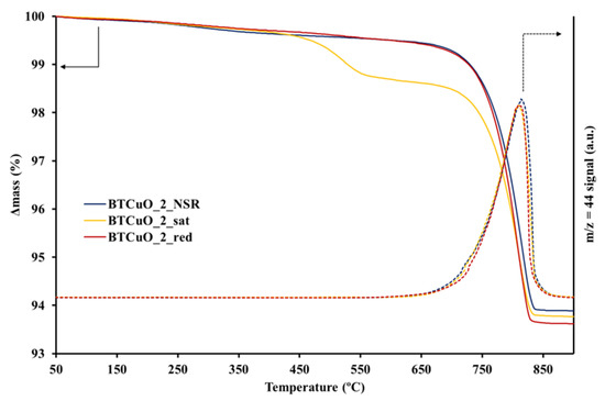 TGA and m/z = 44 profiles in He of the BaTi0.8Cu0.2O3 catalyst after 5 NOx storage-reduction cycles (BTCuO_2_NSR), followed by 1 h NOx exposure to 500 ppm NO + 5% O2 in N2 (BTCuO_2_sat) and finally reduced in 10% H2/N2 (BTCuO_2_red).