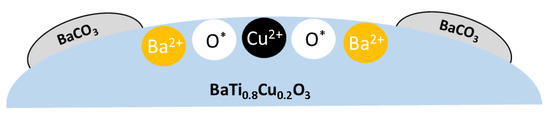 The characterization results revealed that the introduction of copper into the perovskite lattice originates a pseudo distortion of the structure, but also the segregation of phases such as Ba2TiO4 and BaCO3. The formation of Ba2TiO4 is identified as an intermediate in the synthesis of BaTiO3 from BaCO3 and TiO2 reaction by ceramic method [35,36,37,38,39]. Some of these studies conclude that Ba2TiO4 is formed in the reaction zone between TiO2 and BaCO3 such that at the end of the process a thin layer on the BaTiO3 surface may remain. In agreement with this conclusion, the XPS (Cu + Ti)/Ba ratio in Table S1 (calculated from the atomic percentage of Cu, Ti and Ba) shows the surface barium enrichment due to the presence of Ba2TiO4 as a segregated phase [23].