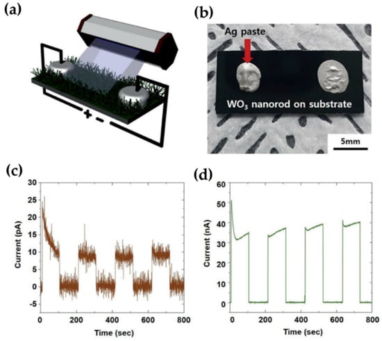 - Kim, Y.; Lee, S.H.; Jeong, S.; Kim, B.J.; Choi, J.Y.; Yu, H.K. Conversion of WO3 thin films into self-crosslinked nanorods for large-scale ultraviolet detection. RSC Adv. 2020, 10, 14147–14153. [Google Scholar] [CrossRef]