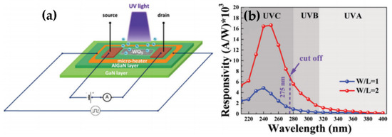 - Sun, J.; Zhang, S.; Zhan, T.; Liu, Z.; Wang, J.; Yi, X.; Li, J.; Sarro, P.M.; Zhang, G. A high responsivity and controllable recovery ultraviolet detector based on a WO3 gate AlGaN/GaN heterostructure with an integrated micro-heater. J. Mater. Chem. C 2020, 8, 5409–5416. [Google Scholar] [CrossRef]