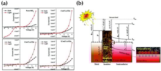 - Raj, M.; Joseph, C.; Subramanian, M.; Perumalsamy, V.; Elayappan, V. Superior photoresponse MIS Schottky barrier diodes with nanoporous: Sn-WO3 films for ultraviolet photodetector application. N. J. Chem. 2020, 44, 7708–7718. [Google Scholar] [CrossRef]