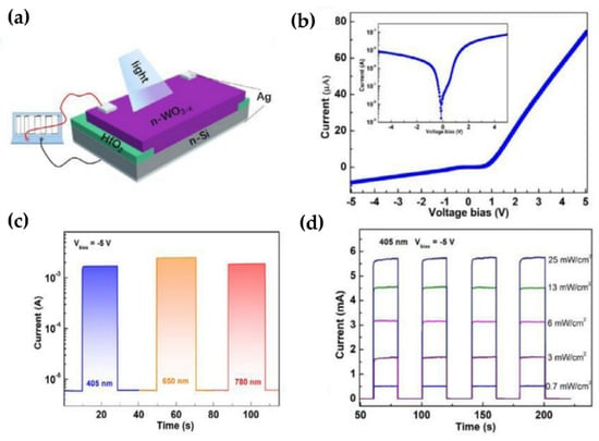 - Zhang, X.; Su, Y.; Tang, Z.; Hu, D.; Wang, Z.; Hou, Y.; Wang, X. WO3−x/Si n-n homotype heterojunction with high performance photodetection characteristics. Scr. Mater. 2020, 189, 89–94. [Google Scholar] [CrossRef]
