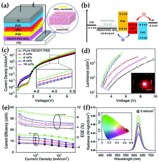 - Zhuo, M.P.; Liang, F.; Shi, Y.L.; Yun, H.; Wang, R.B.; Chen, W.F.; Wang, X.D.; Liao, L.S. WO3 nanobelt doped PEDOT:PSS layers for efficient hole-injection in quantum dot light-emitting diodes. J. Mater. Chem. C 2017, 5, 12343–12348. [Google Scholar] [CrossRef]