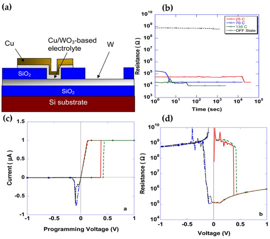 - Kozicki, M.N.; Gopalan, C.; Balakrishnan, M.; Mitkova, M. A Low-power nonvolatile Switching element based on copper-tungsten oxide solid electrolyte. IEEE Trans. Nanotechnol. 2006, 5, 535–544. [Google Scholar] [CrossRef]