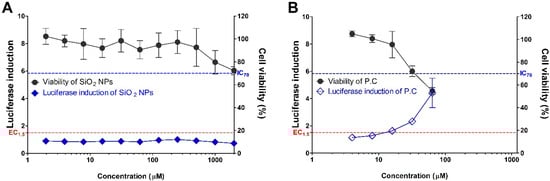 Induction of luciferase activity (blue line) and viability (black line) in the KeratinoSensTM assay. The cells were treated with the (A) Silica NP, and (B) positive control (cinnamic aldehyde, CAS number 14371-10-9). Data are expressed as mean ± SEM (n = 6). Positive control was tested in parallel (4–64 µM).