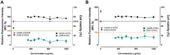 Evaluation of (A) CD86 and (B) CD54 expression, and cell viability in the h-CLAT assay. The cells were treated with the silica NP, and positive control (DNCB, CAS number 97-00-7). Data are expressed as mean ± SEM (n = 6). Positive control was tested in parallel (4 µg/mL). DNCB = 2,4-dinitrochlorobenzene.